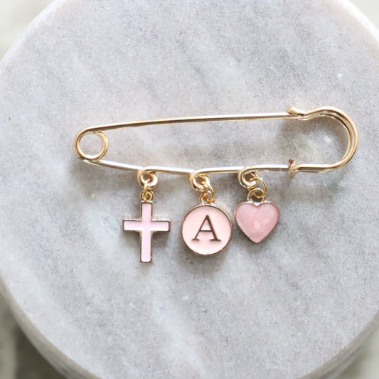 Diamanté Mother Mary & Cross Keepsake Pin with Pink Pearl Beading