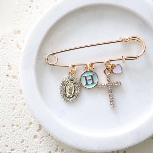 Diamanté Mother Mary & Cross Keepsake Pin with White Pearl Beading